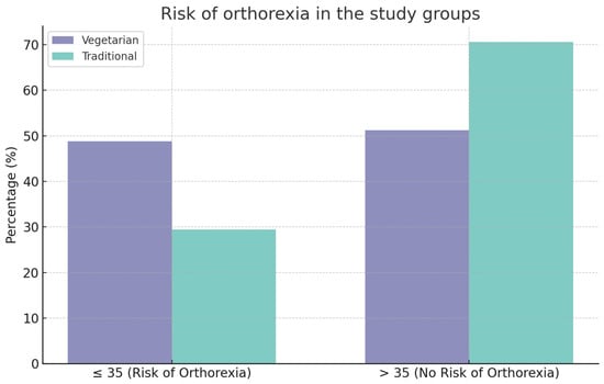 The number of scores obtained by all respondents was also analysed. A score below or equal to 35 was indicative of a risk of orthorexia. In the study group, 48.8 per cent of respondents were at risk of orthorexia, while 29.4 per cent of respondents in the control group were at risk. A significant correlation was observed between the diet followed and the risk of orthorexia symptoms. In a significantly higher proportion of subjects following a vegetarian diet, the result indicated the presence of orthorexia (48.8% vs. 29.4%; p = 0.00673) (Table 6 and Figure 1)