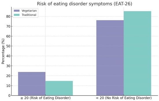 The overall scores of the respondents from both groups were analysed. For 23.8% of the respondents in the vegetarian and vegan group, the overall score indicated the possibility of eating disorder symptoms. In the group of people following a traditional diet, a score indicating the existence of eating disorder symptoms was observed in 14.7%. There was no significant correlation between the diet followed and the risk of eating disorder symptoms among the respondents (p = 0.11391) (Table 9 and Figure 2).
