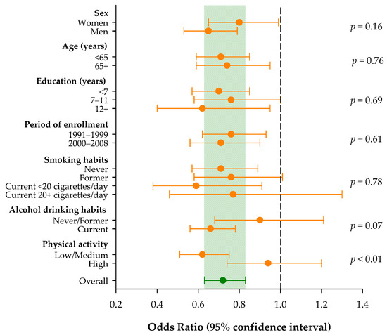 In addition, the ORs and 95% CIs for a 1-point increment in the cholesterol-lowering diet score were further estimated in the overall study sample and across strata of potential effect modifiers, such as socio-demographic characteristics (i.e., sex, age, education, period of enrollment) and lifestyle factors (i.e., tobacco smoking, alcohol drinking, physical activity) that might have an impact on diet or lipid profile. Diabetes mellitus was not considered given the small number of subjects reporting this condition. Heterogeneity across strata was assessed by means of the likelihood-ratio test comparing models with and without the interaction term. All tests were two-sided, and the significance level was set at 0.05. All analyses were conducted using R version 4.0.5.