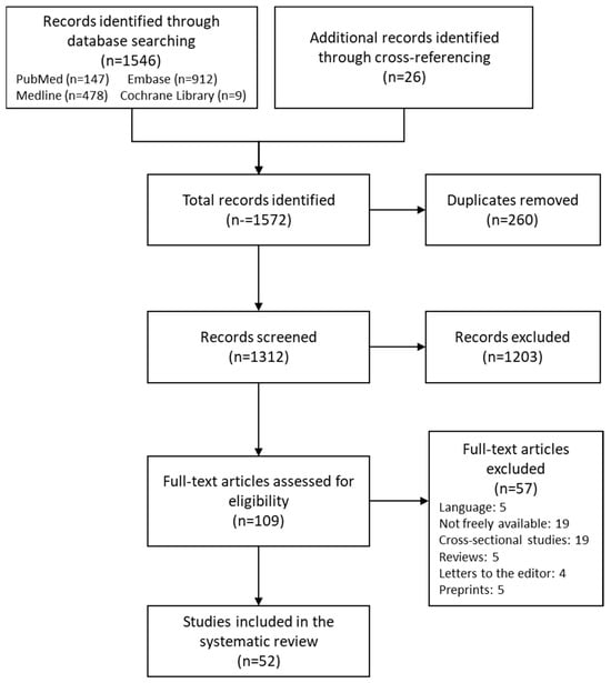 A total of 1572 studies were identified from which 260 were duplicates. After the first selection, 109 studies were selected, and after the second selection, only 52 were determined eligible to be included in qualitative synthesis (See Figure 1). Results were organized in a table according to the gene and polymorphism in order to compare them more efficiently (See Table 1).