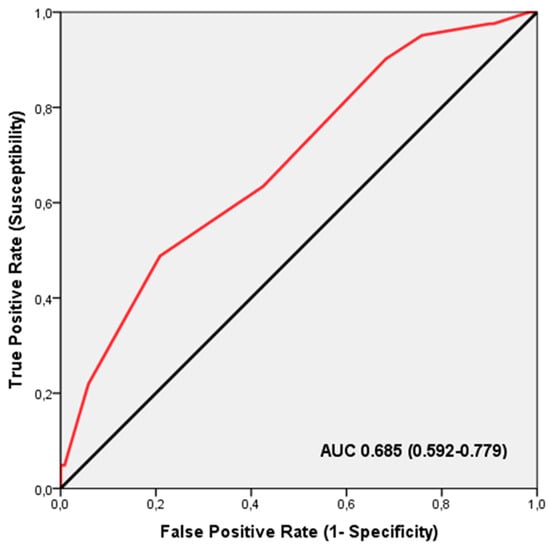 ROC analysis demonstrated that the TGS had a significant discriminatory power in identifying BMI increases among professional football players undergoing creatine supplementation (AUC = 0.685; 95% CI: 0.592–0.779; p = 0.001), with sensitivity at 0.951 and specificity at 0.758 (Figure 2). The TGS threshold for this distinction was 41.66 a.u. Binary logistic regression revealed that players with a TGS above 41.66 a.u. had an odds ratio (OR) of 4.287 (95% CI: 1.426–12.890; p = 0.010) for being responders with increased BMI after the creatine supplementation, compared to those with a TGS below this threshold.