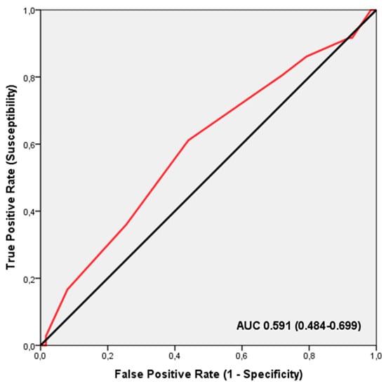 ROC analysis revealed that the TGS did not significantly distinguish between different injury locations in professional football players (AUC = 0.591; 95% CI: 0.484–0.699; p = 0.096), with sensitivity at 0.611 and specificity at 0.440 (Figure 3). The TGS threshold for this analysis was 54.16 a.u. Binary logistic regression indicated that players with a TGS above 54.16 a.u. had an odds ratio (OR) of 2.012 (95% CI: 0.938–4.266; p = 0.073) for a decrease in fat mass following creatine supplementation, compared to those with a TGS below this threshold.