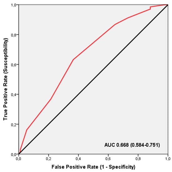 ROC analysis demonstrated that the TGS effectively distinguished between professional football players who experienced an increase in muscle mass following creatine supplementation (AUC = 0.668; 95% CI: 0.584–0.751; p < 0.001), with a sensitivity of 0.632 and specificity of 0.366 (Figure 5), and other players. The threshold TGS value for this distinction was 54.16 a.u. Binary logistic regression further indicated that players with a TGS exceeding 54.16 a.u. had an odds ratio (OR) of 2.985 (95% CI: 1.560–5.711; p = 0.001) for showing a response in muscle mass increase after creatine supplementation, compared to those with a TGS below this threshold.