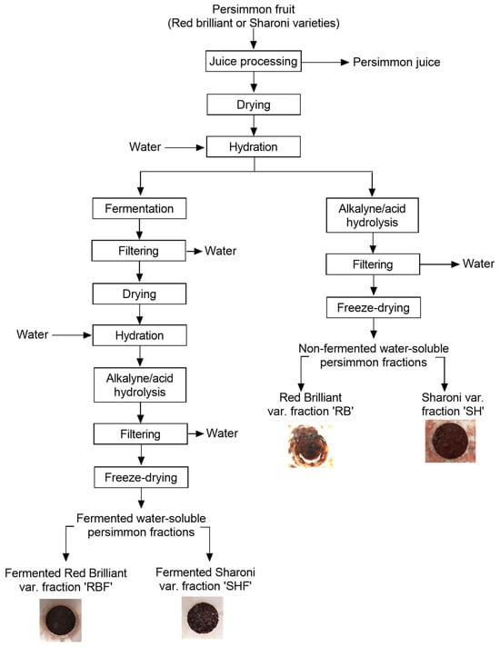 The persimmon fruit by-products from varieties ‘Red Brilliant’ and ‘Sharoni’ were further processed to obtain soluble fiber-rich fractions (Figure 1) to determine their potential functionalities.