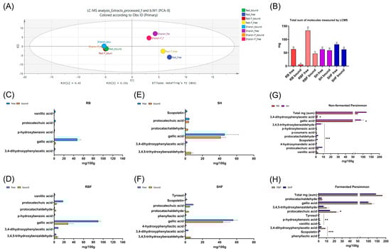 Principal component analysis (PCA) analysis of the persimmon metabolites measured by LCMS showed that the phytochemicals profile of the molecules extracted in the free fractions of the RB and RBF was different than the one from SH and SHF. Furthermore, this analysis also indicates that the profile of the bound phytochemicals, those extracted following the hydrolysis (alkaline and acid), is also different that the one extracted in the free fraction, but the profile of the bound phytochemicals for RB, RBF, SH, and SHF is similar (Figure 2A).