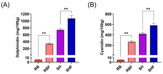 Values of anthocyanins in soluble persimmon fiber-rich fractions. The anthocyanins (A) delphinidin and (B) cyanidin in mg/100 g persimmon sample (as mean ± SD, n = 3) measured by HPLC, where RB, RBF, are fiber-rich persimmon fractions from Brilliant Red variety, fermented (F) or not; respectively, SH, SHF are fiber-rich persimmon fractions from Sharoni variety, fermented (F) or not; ** p < 0.01. RB: Red Brilliant fraction; RBF: Red Brilliant fermented fraction; SH: Sharoni fraction; SHF: Sharoni fermented fraction.