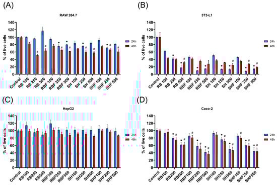 Effect of the different persimmon fiber-rich fractions on the viability on murine and human culture cell lines over 24 and 48 h culture incubations. (A) Effect of the fractions on the RAW 264.7 cell line. (B) Effect of the fractions on the 3T3-L1 cell line differentiated to adipocytes. (C) Effect of the fractions on the HepG2 cell line. (D) Effect of the fractions on the Caco-2 cell line. Viability was expressed as a percentage relative to the control (cells cultured without fraction). Blue bars indicate a 24 h culture with the fractions and red bars indicate 48 h culture. The concentrations of the fractions were 100, 250, and 500 µg/mL. Values are expressed as the mean ± SD (n = 4). * p < 0.05 fractions versus control at 24 h. # p < 0.05 fractions versus control at 48 h. RB: Red Brilliant fraction; RBF: Red Brilliant fermented fraction; SH: Sharoni fraction; SHF: Sharoni fermented fraction.