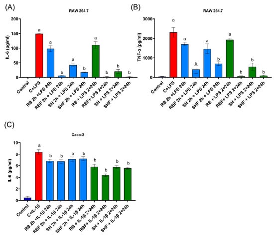 Effects of the different persimmon fiber-rich fractions on inflammation, in murine and human cell lines. (A) Effect of the fractions on IL-6 release, in RAW 264.7 cell line. (B) Effect of the fractions on TNF-α release, in RAW 264.7 cell line. (C) Effect of the fractions on IL-6 release, in Caco-2 cell line. The red bar represents the inflammatory stimulation condition with LPS or IL-1β. The blue bars are the culture conditions with the addition of the fractions before the induction of inflammation and then the addition of LPS (1 µg/mL) or IL-1β (25 ng/mL) with the absence of the fractions. The green bars indicate the simultaneous culture condition of the fractions and LPS (1 µg/mL) or IL-1β (25 ng/mL). The concentration of fraction used was 100 µg/mL. All cultures lasted 24 h. Values are expressed as the mean ± SD (n = 7). Different letters indicate a significant difference (p < 0.05) versus induction of inflammation with LPS or IL-1β. RB: Red Brilliant fraction; RBF: Red Brilliant fermented fraction; SH: Sharoni fraction; SHF: Sharoni fermented fraction. LPS: lipopolysaccharide.