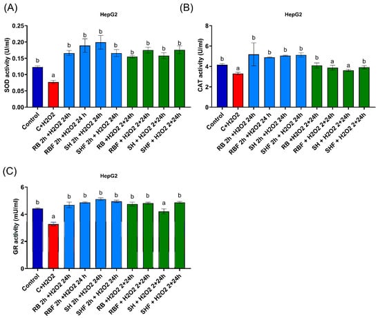 The antioxidant activity of SOD, CAT, and GR enzymes was studied. SOD (Figure 6A) and GR (Figure 6C) enzymes significantly (p < 0.05) increased their activity after induction of oxidative damage with H2O2 when HepG2 cells were cultured with the different fractions and for the two conditions tested. There was only one exception, and that was the cultur.e of SH fractions together with H2O2 (Figure 6C). In the case of CAT enzyme activity (Figure 6B), there was a significant (p < 0.05) increase in its activity for all fractions in the condition of previous culture with the fractions. When RBF and SH fractions and H2O2 were cultured simultaneously, there was no increase in the activity of the antioxidant enzyme.