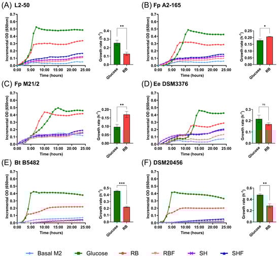 All strains showed variable, although significant, growth (p < 0.01) with the RB fraction (Figure 7), while no significant growth was detected with RBF, SH, and SHF fractions. Faecalibacterium prausnitzii strains (A2-165 and M21/2) showed a significantly (p < 0.05 and p < 0.01, respectively) higher growth rate with RB fraction as a carbohydrate source than with glucose (Figure 7B,C). For the rest of the species, except for Eubacterium eligens (Figure 7D), the growth rate with RB fraction as a carbohydrate source was significantly (p < 0.01, p < 0.001 and p < 0.01, respectively) lower than glucose (Figure 7A,E,F).