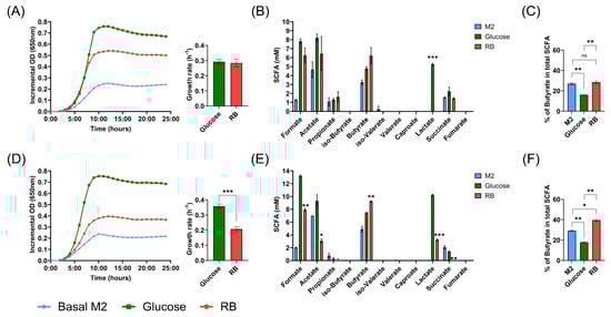 Growth stimulation by RB, RBF, SH, and SHF fiber-rich fractions and comparison of growth rates (h−1) between glucose and RB fraction in different bacterial strains. (A) Coprococcus species L2-50; (B) Faecalibacterium prausnitzii A2–165; (C) Faecalibacterium prausnitzii M21/2; (D) Eubacterium eligens DSM3376; (E) Bacteroides thetaiotaomicron B5482; (F) Bifidobacterium bifidum DSM20456. The final fraction concentration was 0.2%. Growth stimulation in microtiter plates values were expressed as mean OD650 values. Values in growth rate were expressed as mean ± SD (n = 3). Basal M2 medium contains no added carbohydrate source. * p < 0.05; ** p < 0.01; *** p < 0.001. ns: not significant. RB: Red Brilliant fraction; RBF: Red Brilliant fermented fraction; SH: Sharoni fraction; SHF: Sharoni fermented fraction.