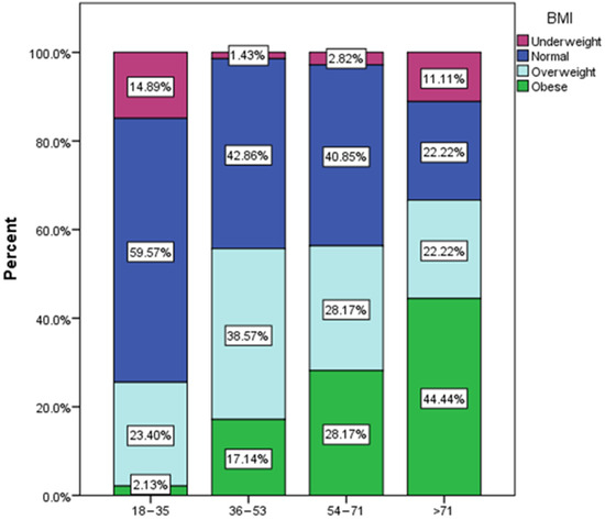 Figure 1 shows the distribution of BMI groups according to age group. Most of the normal weight (59.57%) and underweight respondents (14.89%) are among the young respondents (18–35 years old), and most of the obese (44.44%) are among respondents over 71 years old.