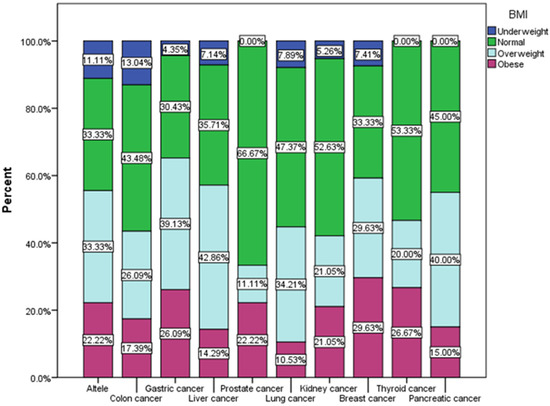 According to the data in Figure 2, we observe that in each category of oncological pathology, normal weight respondents predominate, constituting the majority of those with prostate cancer (66.67%, χ2 = 21.33, p = 0.074) and kidney cancer, but in each category of pathology in oncology, we also have overweight respondents, comprising the majority of those with liver cancer (42.86%), pancreatic cancer (40%) and gastric cancer (39.13%), and also obese, comprising the majority among those with breast cancer (29.63%), thyroid cancer (26.67%) and gastric cancer (26.09%).