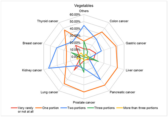 Figure 4 highlights a relatively low consumption also in terms of vegetable products, so the statistical processing of the data indicated a consumption tendency among the respondents of a single portion of vegetables per day and a higher consumption (two portions of vegetables per day) among respondents with colon cancer and liver and kidney cancer.