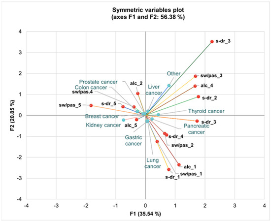 Multiple correspondence analysis (MCA) for associations between healthy dietary habits and types of cancer across axes F1 and F2, representing 56.38% of total variance. Legend: alc—alcoholic beverages, s-dr—sweetened drinks, sw/pas—sweets/pastries; code 1–5 associated with the consumption frequency.
