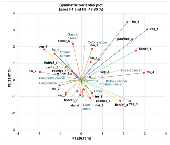 Multiple correspondence analysis (MCA) for associations between healthy dietary habits and types of cancer across axes F1 and F2, representing 47.80% of total variance. Legend: veg—vegetable products; fru—fruits; fish/sf—fish or sea food; dai—dairy products; pas/rice—pasta or rice; code 1–5 associated with the consumption frequency.