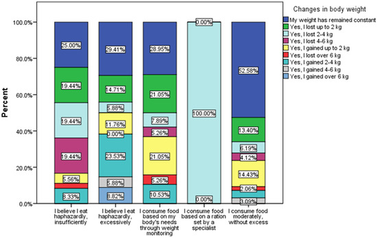 The respondents who turned to specialists in order to have a balanced food consumption adapted to the needs of the body do not have large fluctuations related to body weight (Figure 7); they all presented a weight loss of 2–4 kg, and all the others presented various changes in terms of regarding body weight or, in different proportions, a maintenance of body weight, the highest percentage of respondents who kept their body weight unchanged (52.58%) being in the group of those who declared that they used to consume food in moderation (χ2 = 61.28, p < 0.0001).