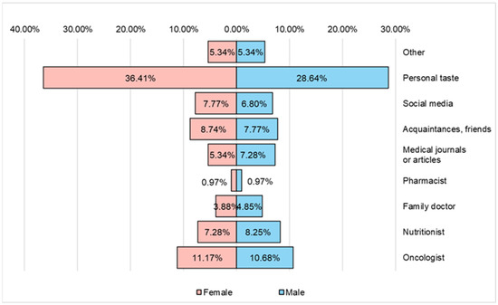 According to the data presented in Figure 8, the respondents participating in the study declared that food products and food supplements were chosen according to personal tastes (36.41% of women and 28.64% of men), a small percentage of respondents turn to the advice of a nutritionist (7.28% of women and 8.25% of men) or to the advice of an oncologist (11.17% of women and 10.68% of men).
