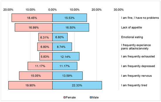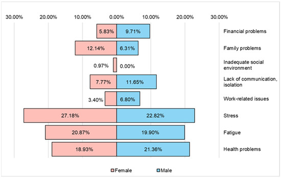 The main factors that affect the mental state of respondents with oncological conditions participating in the study are (Figure 9) stress, fatigue and health problems. Female respondents (27.18%) are more stressed than male respondents (22.82%).