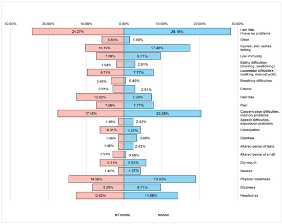 The main clinical manifestations most often faced by the respondents in the last period are represented by (Figure 11) injuries, skin eruptions, itching, difficulties in concentration, memory problems, states of physical weakness, and headaches (especially male respondents are more affected by these disturbing clinical manifestations).
