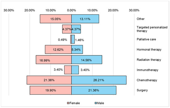 Figure 12 shows the main types of therapy followed by respondents with oncological conditions participating in the study. Chemotherapy, surgery and radiotherapy predominate. From the group of respondents, a very small percentage benefited from targeted personalized therapy.