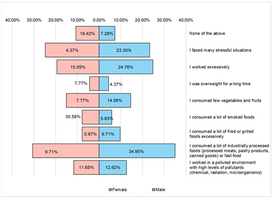 In the case of male respondents, the main health risk factors they faced in the past are represented by (Figure 13) the increased consumption of industrially processed foods (sausages, pastries, and canned goods) or fast food products (34.95%), excessive work (24.76%) and stressful situations (23.30%). In the case of female respondents, excessive work (15.5%) and work in environments with high pollution (11.65%) are noteworthy.