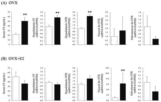 Serum OT concentrations, hypothalamic mRNA levels of OT and the OTR, and visceral and subcutaneous fat OTR mRNA levels in control (⧠) and testosterone-administered (■) female rats. The upper and lower rows show the results for ovariectomized rats that (A) did not (OVX) and (B) did (OVX + E2) receive estrogen supplementation, respectively. n = 7 per group. Data are expressed as means ± SEM. ** p < 0.01.
