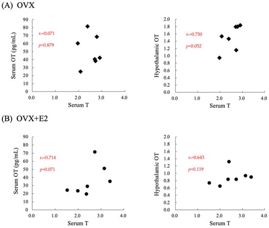 In the OVX group, there was no correlation between serum testosterone and OT levels, or between serum testosterone levels and hypothalamic OT mRNA levels (Figure 3A). In the OVX + E2 group, there was no correlation between serum testosterone and OT levels, or between serum testosterone levels and hypothalamic OT mRNA levels (Figure 3B).