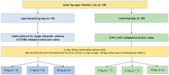 The OBG isolates of high and low molar masses were prepared from the oat bran by the patented method described in previous work [21,22]. Briefly, the alkaline extraction and subsequent precipitation at the isoelectric point were used to remove the remaining proteins in the OBG isolate. Next, the obtained preparation was purified with proteolytic, pectinolytic and amylolytic enzymes. To maintain the final fraction of OBG in the range of nominal molecular mass, the conditions of the process were appropriately selected. The molar mass was determined using HPLC-SEC according to commercially available standards of (1-3)(1-4)-beta-d-glucan. The adult male outbred Sprague–Dawley Crl:CD(SD) rats (initial weight 415.0 ± 1.5 g, n = 38) were purchased from The Charles River Laboratories (Sulzfeld, Germany). This Sprague–Dawley rat strain is commonly used as an animal model for colitis. All animals were kept in the animal house of the Institute of Veterinary Medicine at Warsaw University of Life Sciences, Poland under standard conditions (temperature: 22 ± 1 °C, relative humidity: 50 ± 5% relative, light/dark cycle: 12/12 h). The rats were housed in individual polyurethane cages with access to water and AIN-93M feed ad libitum. To enrich the environment in rats cages we used glass balls and metal round items. All experimental procedures were approved by the 2nd Local Animal Care and Use Committee, Warsaw, Poland (Resolution No. 60/2015) and were in accordance with the UE Directive (2010/63/UE), the Polish legal regulation, and with respect to the 3R (Replacement, Reduction and Refinement) rules.