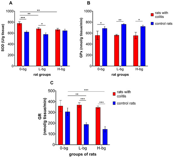 Activity of superoxide dismutase (SOD) (A), glutathione peroxidase (GPx) (B) and glutathione reductase (GR) (C) in testes of rats with TNBS-induced colitis; 0-bg, rats fed with standard feed (without OBG); L-bg, rats fed with feed containing 1% of low molar mass OBG; H-bg, rats fed with feed containing 1% of high molar mass OBG. Data are expressed as mean ± SEM; *,**,***—denote statistically significant differences at p < 0.05, p < 0.01 and p < 0.001, respectively; two-way analysis of variance (ANOVA) with Duncan’s post hoc test.