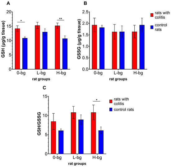 Testicular concentration of glutathione (GSH) (A), glutathione disulfide (GSSG) (B) and GSH to GSSG ratio (C) in rats with TNBS-induced colitis; 0-bg, rats fed with standard feed (without OBG); L-bg, rats fed with feed containing 1% of low molar mass OBG; H-bg, rats fed with feed containing 1% of high molar mass OBG. Data are expressed as mean ± SEM; *, **—denotes a statistically significant difference at p < 0.05 and p < 0.01, respectively; two-way analysis of variance (ANOVA) with Duncan’s post hoc test.