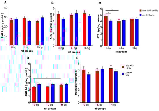 Angiotensin II (ANG II) (A), angiotensin III (ANG III) (B), receptor for angiotensin II (ATR1) (C), angiotensin 1–7 (ANG 1–7) (D) and MasR receptor for ANG 1–7 (E) protein level in testes of rats with TNBS-induced colitis; 0-bg, rats fed with standard feed (without OBG); L-bg, rats fed with feed containing 1% of low molar mass OBG; H-bg, rats fed with feed containing 1% of high molar mass OBG. Data are expressed as mean ± SEM; *—denotes statistically significant difference, * p < 0.05; ** p < 0.01, two-way analysis of variance (ANOVA) with Duncan’s post-hoc test.