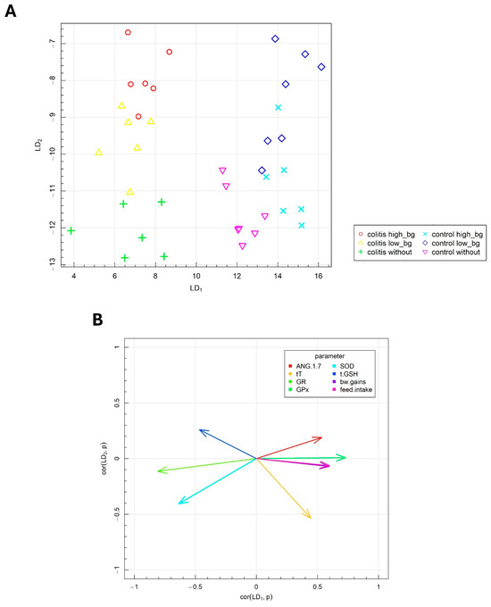 The FLD analysis also provided insights into the combination of parameters that distinguish the effects of different molar masses of OBG supplementation in the vertical plane (LD2). The vertical plane (LD2) facilitated the separation of the control group from the groups whose diets were supplemented with either low- or high-molar mass OBG. The effects of OBG varied slightly between healthy animals and those with colitis. The parameters that primarily differentiated the groups in response to oat OBG supplementation included SOD activity, GSH, T and ANG 1–7 level in testes.