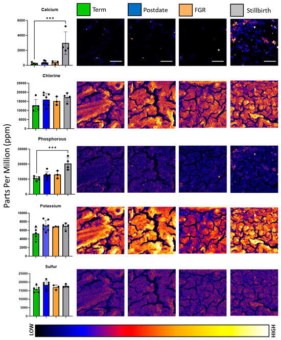 Representative elemental maps of calcium, chlorine, phosphorous, potassium, and sulphur in term, postdate, foetal growth-restricted (FGR), and stillbirth placentae. Colour bar is a visual representation of the intensity of the signal from low (black/blue) to high (yellow/white). Scale bars represent 300 μm and are applicable for all images. Left-hand bar charts indicate the distribution of elemental concentrations per group, with mean and standard deviation indicated. Bar chart colour corresponds to the key at the top of the figure, with green representing healthy term, blue representing postdates, peach representing foetal growth restriction, and grey representing stillbirth. Each elemental map measures 1.2 mm by 1.2 mm. For clarity of image and element abundance, all maps were set to adjust the maximum image value to display as 50% of the maximum; *** signifies p < 0.0005.