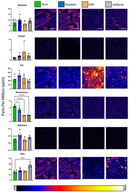 Representative elemental maps of bromine, copper, iron, molybdenum, selenium, and zinc in normal, postdate, foetal growth-restricted (FGR), and stillbirth placentae. Colour bar is a visual representation of the intensity of the signal from low (black/blue) to high (yellow/white). Scale bars represent 300 μm and are applicable for all images. Left-hand bar charts present the distribution of elemental concentrations per group, with mean and standard deviation indicated. Bar chart colour corresponds to the key at the top of the figure, with green representing healthy term, blue representing postdates, peach representing foetal growth restriction, and grey representing stillbirth. Each elemental map measures 1.2 mm by 1.2 mm. For clarity of image and element abundance, all maps were set to adjust the maximum image value to display as 50% of the maximum; * signifies p < 0.05, *** signifies p < 0.0005; **** signifies p < 0.0001.