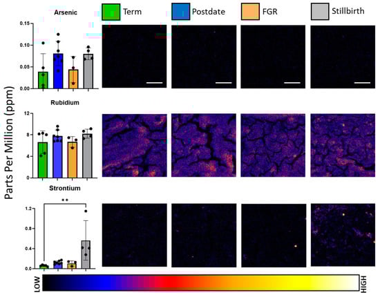 Representative elemental maps of arsenic, rubidium, and strontium, in normal, postdate, foetal growth-restricted (FGR), and stillbirth placentae. Colour bar is a visual representation of the intensity of the signal from low (black/blue) to high (yellow/white). Scale bars represent 300 μm and are applicable for all images. Left-hand bar charts present the distribution of elemental concentrations per group, with mean and standard deviation indicated. Bar chart colour corresponds to the key at the top of the figure, with green representing healthy term, blue representing postdates, peach representing foetal growth restriction, and grey representing stillbirth. Each elemental map measures 1.2 mm by 1.2 mm. For clarity of image and element abundance, all maps were set to adjust the maximum image value to display as 50% of the maximum; ** signifies p < 0.005.