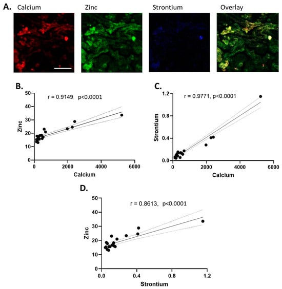 (A) Representative false-colour elemental maps of calcium (red), zinc (green), and strontium (blue), and overlay in a stillbirth placenta. Scale bar represents 200 μm and is applicable for all images. Each elemental map measures 0.7 mm by 0.7 mm. For clarity of image and element abundance, all maps were set to adjust the maximum image value to display as 50% of the maximum. The Pearson correlation test was performed with a 95% confidence interval for (B) zinc vs. calcium, (C) strontium vs. calcium, and (D) strontium vs. zinc. R values and p values are displayed.