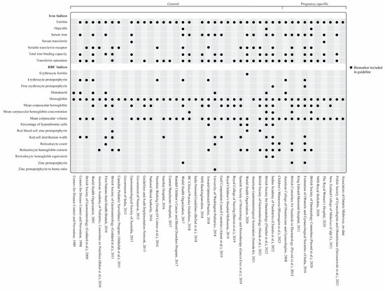 Figure 4. Recommended biomarkers for the diagnosis of NAID/IDA in the included disease-specific guidelines [47,49,50,56,59,60,61,62,63,66,69,79,82,83,84].