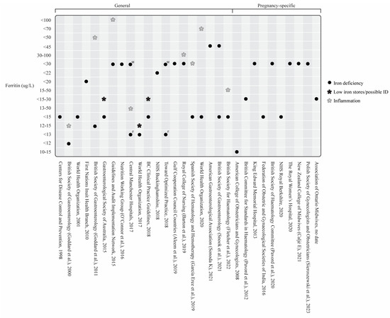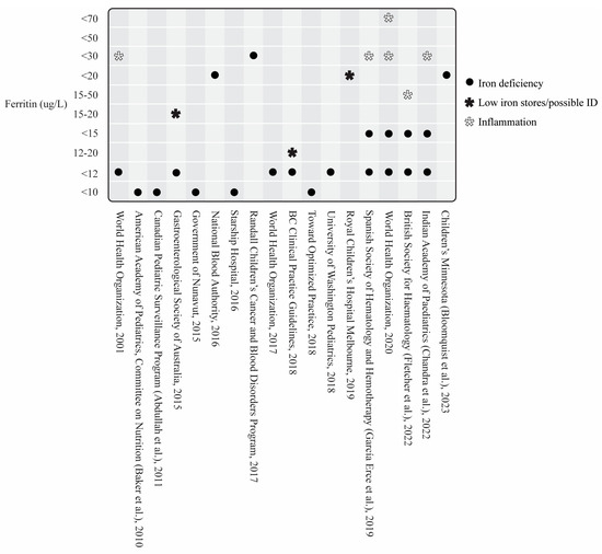 Figure 6. Pediatric-specific serum ferritin cutoff values of the included general ID guidelines [30,31,35,37,38,40,41,42,43,48,52,58,64,65,72,73,74,76].