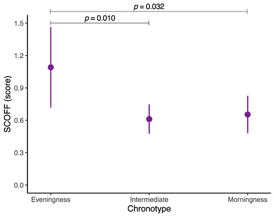 Estimated marginal means of SCOFF based on the different chronotypes are found in Figure 1. After adjusting for potential covariates (i.e., sex, age, socioeconomic status, body mass index, physical activity, sedentary behavior, adherence to the Mediterranean diet, and energy intake), we identified significant differences in the SCOFF score among the different chronotypes (i.e., eveningness, intermediate, and morningness chronotypes). Participants with an eveningness chronotype showed a higher SCOFF score (M = 1.1; 95% CI 0.7 to 1.5) in comparison with adolescents with a morningness chronotype (M = 0.7; 95% CI 0.5 to 0.8) (p = 0.010), as well as with those with an intermediate chronotype (M = 0.6; 95% CI 0.5 to 0.8) (p = 0.032). The full result of the GLM assessing the relationship between chronotype and SCOFF can be found in Table S1.