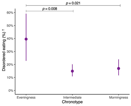 Predictive probabilities of disordered eating based on the different chronotypes in Spanish adolescents. Data are shown as dots (predictive probabilities) and lines (95% confidence intervals). Adjusted for sex, age, socioeconomic status, physical activity, sedentary behavior, adherence to the Mediterranean diet, and energy intake. † Cutoff point for disordered eating ≥ 2 points on the SCOFF questionnaire. p-values for the difference in predicted probabilities among the different chronotypes were obtained from a Wald test for pairwise comparisons following a robust generalized linear model.