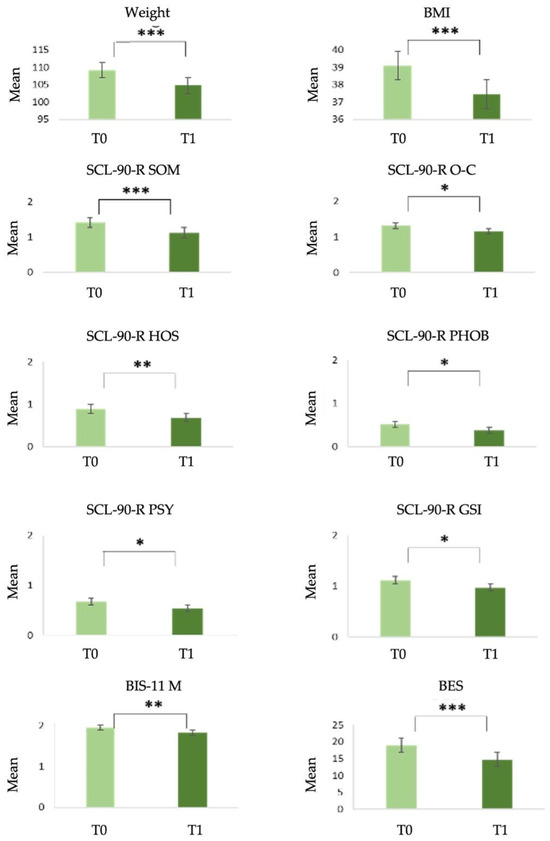 Statistically significant differences in Group 1 between T0 and T1. Note: * p < 0.05; ** p < 0.01; and *** p < 0.001. SCL-90-R, Symptom Checklist-90—Revised; BIS-11, Barratt Impulsiveness Scale-11; BES, Binge-Eating Scale; BMI, body mass index (kg/m2); and weight (kg).