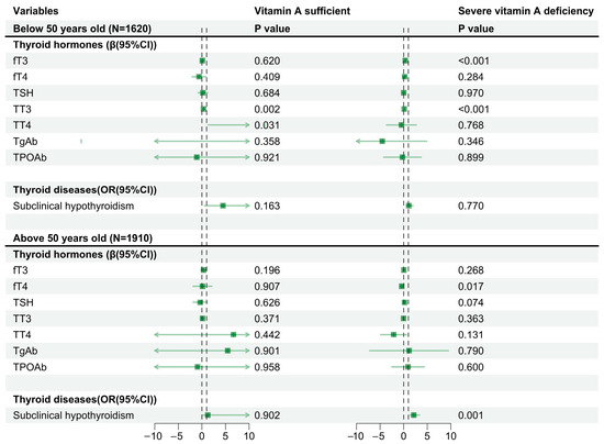 The results of linear and regression models regarding the association between AIP and thyroid hormones and diseases, stratified by different vitamin A levels, sex, and age, are shown in Figure 1 and Figure 2. In different sex groups, AIP increased the risk of subclinical hypothyroidism in women (OR = 2.44, 95%CI: 1.55, 3.86, p < 0.001) in the presence of severe vitamin A deficiency, but this phenomenon was not found in men (OR = 1.03, 95%CI: 0.55, 1.91, p = 0.927). Across different age groups, AIP increases the risk of subclinical hypothyroidism in older age groups (>50 years old) (OR = 2.14, 95%CI: 1.36, 3.38, p = 0.001) in the presence of severe vitamin A deficiency, but this phenomenon was not observed in the younger age group (<50 years old) (OR = 1.09, 95%CI: 0.60, 1.99, p = 0.770).