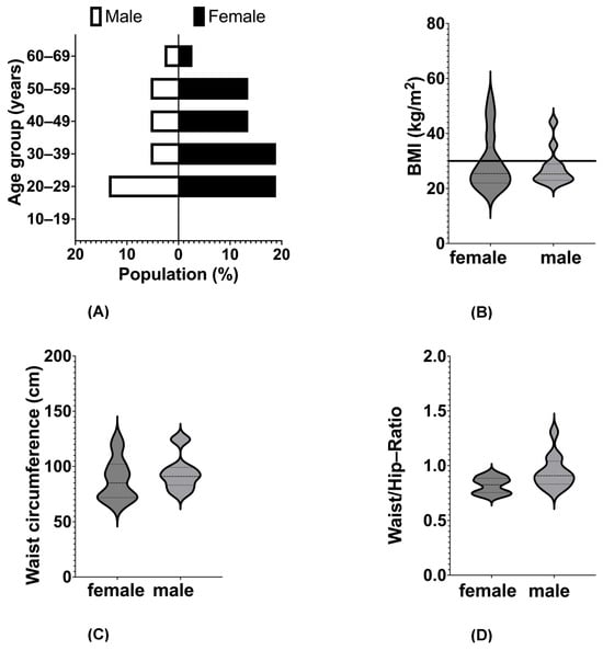 Main characteristics of the study population (N = 38) stratified by sex. Dotted lines indicate 25th and 75th percentiles, dashed lines indicate subgroup’s median and the solid line indicates the cut-off for BMI of 30 kg/m2. (A) Population pyramid for age. (B) Distribution of BMI. (C) Distribution of waist circumference. (D) Distribution of waist-to-hip-ratio. Abbreviations: BMI, body mass index.