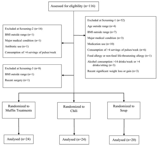 This study was conducted at the Human Nutraceutical Research Unit (HNRU) at the University of Guelph, was approved by the University of Guelph Research Ethics Board (REB#16AU008) and was registered on ClinicalTrials.gov (NCT02923089). A randomized, crossover study design was used for each of the three treatments (muffin, chili, soup). Participants in each treatment group attended three 3 h study visits (small green lentil, split red lentil, control) separated by three- to seven-day washout periods.