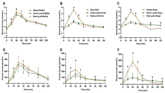 Postprandial blood glucose (top panel (A–C)) and plasma insulin (bottom panel (D–F)) response curves of healthy adult participants after muffin (n = 24), chili (n = 24) and soup (n = 20) treatments. Blood glucose values are means ± SE. Plasma insulin values are medians and 95% confidence intervals. * Both lentil treatments were significantly different from control (p < 0.05); # red lentil treatment was significantly different from control (p < 0.05); † green lentil treatment was significantly different from control (p < 0.05).