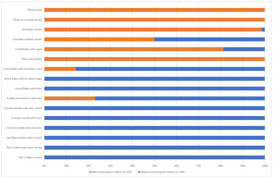 In our sample, 95.4% of “children’s” cereals did not comply with WHO criteria, compared with 67.8% for other cereals, which seems to show that their nutritional composition is of poorer quality and that they are less suitable for the children for whom they are intended (Table 2). Almost all of “children’s” cereals (96.1%) exceed the permitted level of total sugars. This result is in line with those of numerous studies [32,33] which conclude that they are richer in sugars and poorer in fibre. According to a study carried out in Mexico on 3755 adults [34], even if parents are aware of this unsuitable nutritional profile, when buying breakfast cereals they allow themselves to be influenced by their children, who are themselves influenced by the marketing techniques on the packaging.