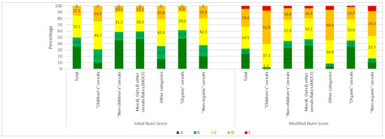 With the initial Nutri-Score, “children’s” cereals have significantly less Nutri-Score A, and more Nutri-Score B, C and D than other cereals (OR = 3.6, CI95%: 2.6–5.2). The modified version of the Nutri-Score further accentuates the difference with other cereals (OR = 6.5, CI95%: 4.5–9.4). For children’s cereals, Nutri-Scores A and B virtually disappear, and the E score, which was totally absent from the initial version, appears.