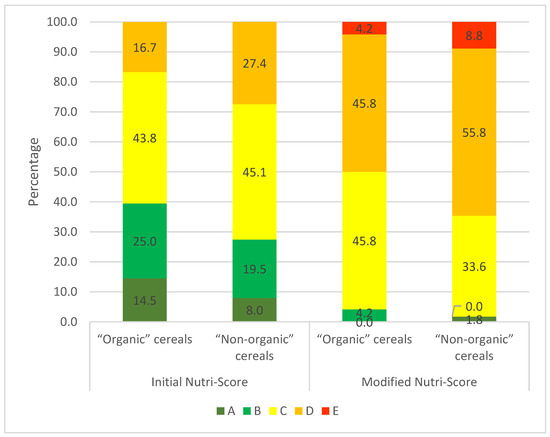 In the initial version of the Nutri-Score, “organic” cereals have significantly more A scores (47.9%) and fewer D scores (9.5%) (Figure 4) than conventional cereals, with 20.2% and 19.8%, respectively (p < 0.0001) (Supplemental Table S3). The modified version of the Nutri-Score algorithm exacerbates the nutritional superiority of “organic” cereals with fewer Nutri-Score D scores (19.9% compared with 39.3% for “non-organic” cereals) and more A scores (35.5% compared with 10.3% for “non-organic” cereals) (Figure 4). Furthermore, with the modified Nutri-Score, the E score is present in 1.3% of “organic” cereals (Figure 4) compared with 8.3% of “non-organic cereals” (Supplemental Table S3). MOCFs score more favourably than other cereals. However, the modified Nutri-Score downgrades MOCFs in the same way as all the other categories, with the appearance of an E score.