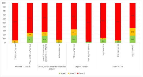 When we analyse the points of sale, organic shops contain the most unprocessed/lightly processed products (18.1%), compared to discount stores with 4.7% and supermarkets with 9.8% (Figure 6). “Children’s” cereals have longer ingredient lists (median: 14 elements compared with 12 for other cereals). They also contain more additives (median: 1.6 against 0.8) with a maximum of 7 (Supplemental Table S2). The MOCF category has fewer ingredients (median: 12 elements compared with 14) and fewer additives (0.7 on average compared with 1.5) than other cereals. There are fewer ingredients in “organic” products (median: 11 elements compared with 17) and virtually no additives (0.4 on average compared with 1.7) compared with “non-organic” cereals.